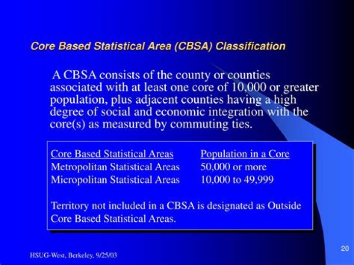 The Office of Management and Budget (OMB) uses core based statistical area (CBSA) to uniformly define different population and geographic descriptions. Introduced in 2000, the definition for a CBSA is a functional region with at least 10,000 people. A micropolitan statistical area has 10,000 to 49,999 people along with a principle city, and a metropolitan area has 50,000 or more people.