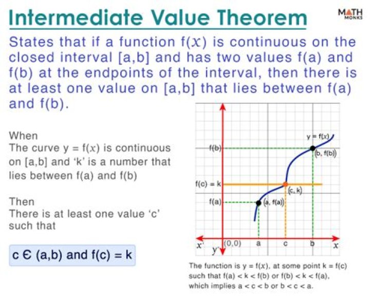 The intermediate value theorem is a continuous function theorem. The intermediate value theorem has implications in mathematics, especially in functional analysis. This theorem explains the virtues of continuity of functions. Two important cases of this theorem are widely used in mathematics.