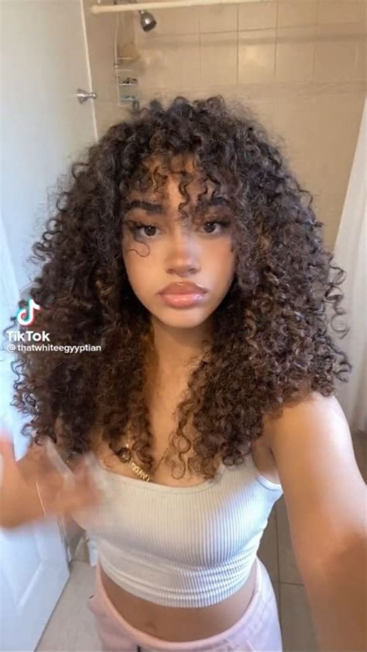 - Shoulder-length curls with bangs.