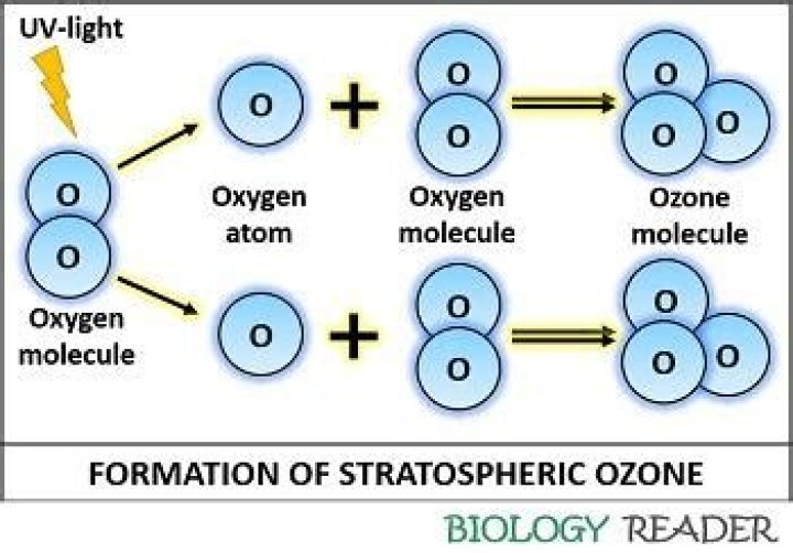 Colorless (or faintly blue), unstable (reactive), and water soluble gas having chlorine-like odor, and formed in the upper atmosphere by the action of solar radiation on oxygen. Its presence as a layer in stratosphere serves as a screen (called ozone shield) to block harmful ultraviolet radiation from reaching the earths surface. At ground level it is formed by the combination of hydrocarbons and nitrogen oxides in the presence of sunlight and is the main ingredient of smog. In high-enough concentrations it can reduce lung function, inflame lung tissue, and cause coughing, shortness of breath, and other respiratory problems. Excessive exposure can result in permanent lung damage. Used commercially for bleaching, deodorizing, and disinfecting. Also called iriatomic oxygen or trioxygen. See also ozone layer.
