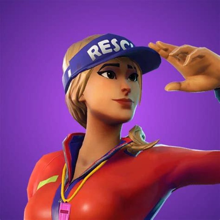 The women’s Sun Strider Skin has a red-orange jacket and mini-shorts of the same color. The outfit also includes a blue umbrella hat with RESCUE written in white.