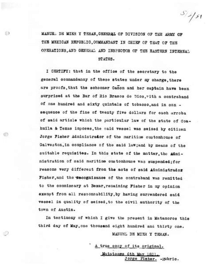 His proposal was incorporated into the law of April 6, 1830, which also included a ban on slavery and the closure of the borders of Texas to Americans. After the reports were ready, Mier y Terán was ordered to travel to Tampico in August 1829 to repel a Spanish invasion.
